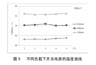 改進(jìn)后,為驗證改進(jìn)效果,對開關(guān)電源分別在0.5倍、0.8倍及1.0倍負(fù)載下進(jìn)行了為期5天的帶負(fù)荷試驗,圖5為不同負(fù)載下開關(guān)電源的溫度曲線,由圖5可知,隨著負(fù)荷的增大,開關(guān)電源問題總體呈上升趨勢;負(fù)載不變的情況下,同一溫度曲線基本保持平滑;開關(guān)電源在額定負(fù)載下運(yùn)行,最高溫度不超過57℃,未達(dá)報警值,開關(guān)電源可靠性得到顯著提高。