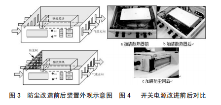 3.2在裝置本體進(jìn)風(fēng)孔加防塵網(wǎng),防止灰塵進(jìn)入裝置內(nèi)部,設(shè)備維護(hù)人員定期對濾網(wǎng)進(jìn)行清掃,從而減輕元器件表面覆塵,利于裝置正常散熱,如圖3所示加裝防塵網(wǎng)后開關(guān)電源示意圖。對裝置實施上述改進(jìn)后,其改進(jìn)前后對比如圖4所示。