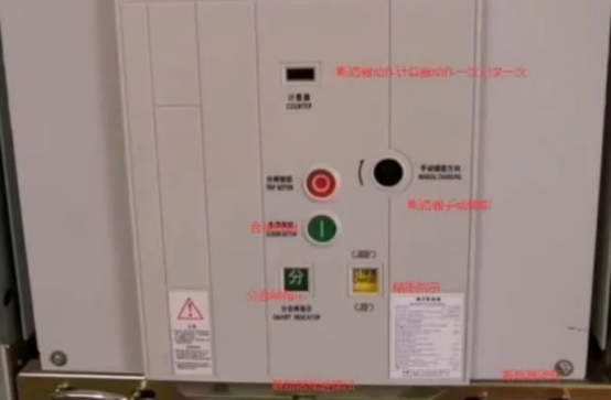 1,斷路器在分閘已儲能狀況,儲能指示顯現(xiàn)已儲能,儲能繃簧已擺開,面板得合閘按鈕在上圖中的下孔中,假如斷路器未儲能是合不了閘的
