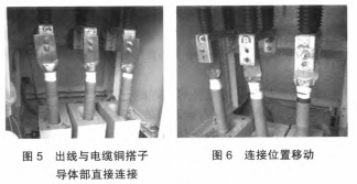 穿墻套管下部為出線,與電纜銅搭子導(dǎo)體部直接聯(lián)接,如圖5所示。撤消聯(lián)接螺栓后發(fā)生聯(lián)接方位移動(dòng),如圖6所示。此現(xiàn)象闡明電纜銅搭子與穿墻套管存在很大的聯(lián)接變形,并發(fā)生應(yīng)力,在電纜通電后發(fā)生的電動(dòng)力和聯(lián)接應(yīng)力進(jìn)一步作用于穿墻套管,使得穿墻套管發(fā)生碎裂。