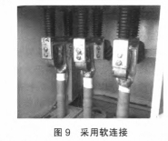 (2)穿墻套管下部與電纜銅搭子導(dǎo)體部分聯(lián)接選用軟聯(lián)接過(guò)渡,如圖9所示,可以去除硬聯(lián)接發(fā)生的應(yīng)力,一起消除電纜通電后發(fā)生的電動(dòng)力,隔絕了對(duì)穿墻套管的應(yīng)力作用。