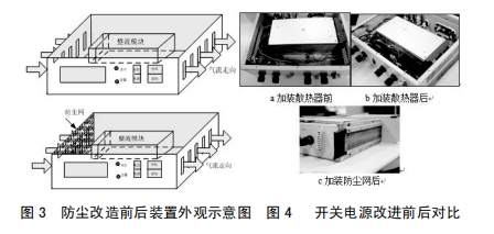 3.2在裝置本體進(jìn)風(fēng)孔加防塵網(wǎng),避免塵埃進(jìn)入裝置內(nèi)部,設(shè)備保護(hù)人員定時(shí)對(duì)濾網(wǎng)中止清掃,然后減輕元器件表面覆塵,利于裝置正常散熱,如圖3所示加裝防塵網(wǎng)后開關(guān)電源表明圖。對(duì)裝置實(shí)施上述改進(jìn)后,其改進(jìn)前后對(duì)比如圖4所示。