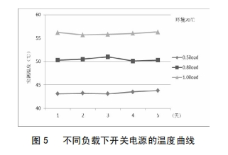 改進(jìn)后,為考證改進(jìn)效果,對(duì)開關(guān)電源分別在0.5倍、0.8倍及1.0倍負(fù)載下中止了為期5天的帶負(fù)荷實(shí)驗(yàn),圖5為不同負(fù)載下開關(guān)電源的溫度曲線,由圖5可知,跟著負(fù)荷的增大,開關(guān)電源問(wèn)題全體呈上升趨向;負(fù)載不變的狀況下,同一溫度曲線底子堅(jiān)持滑潤(rùn);開關(guān)電源在額定負(fù)載下作業(yè),最高溫度不超越57℃,未達(dá)報(bào)警值,開關(guān)電源可靠性得到明顯前進(jìn)。
