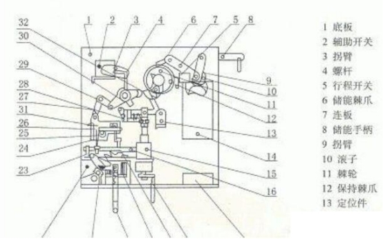 此組織為電動儲能,電動分合閘,一同具有手動功用。整個結(jié)構(gòu)由合閘繃簧,儲能體系,過流脫扣器,分合閘線圈,手動分合閘體系,輔佐開關,儲能指示等部件組成。