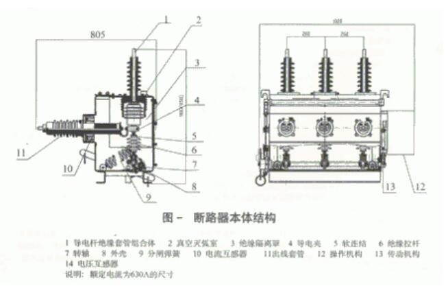 斷路器本體部分由導電回路,絕緣體系,密封件和殼體組成。全體結(jié)構(gòu)為三相共箱式。其間導電回路由進出線導電桿,進出線絕緣支座,導電夾,軟聯(lián)接與真空滅弧室聯(lián)接而成。